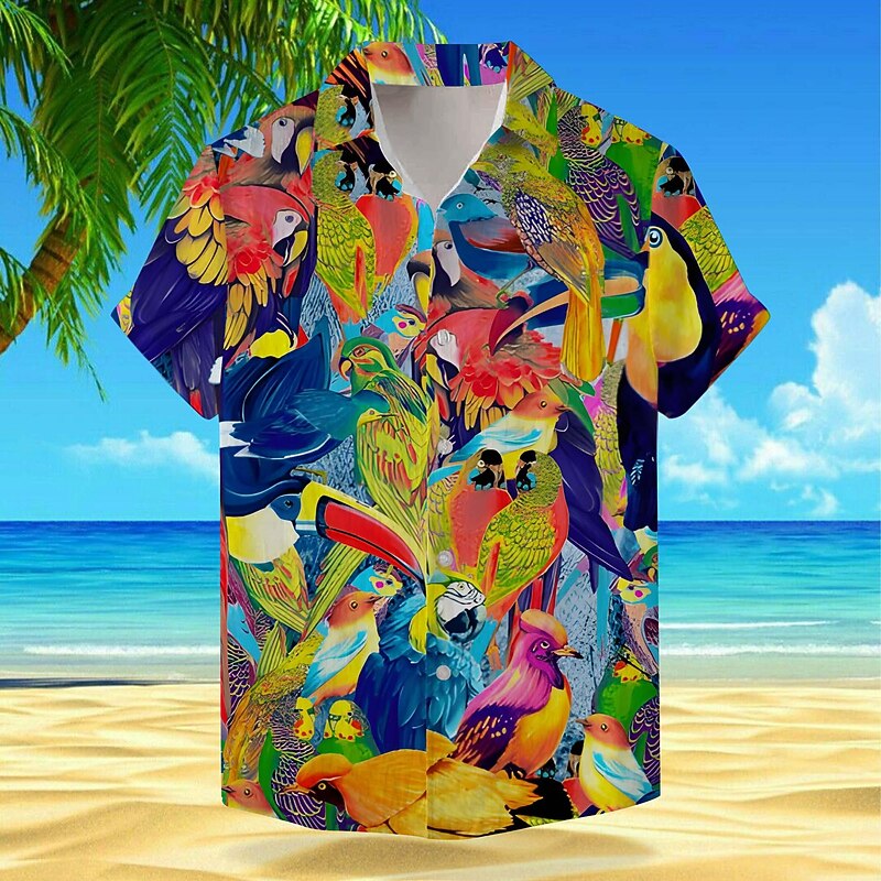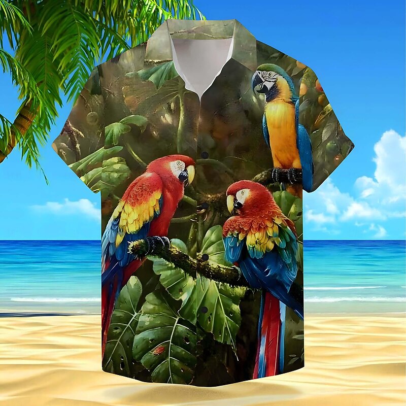 Highlights [Fabric] : Crafted from a high-quality, breathable 4-way stretch fabric, this Hawaiian shirt offers a lightweight feel, perfect for keeping cool and comfortable during warm summer days. The fabric blend is ideal for vacation wear, combining practicality with style. [Fit and Style] : Featuring a relaxed fit, this short sleeve shirt provides an easy-going and classic look. The shirt comes with a standard button-down front and a traditional turndown collar, ensuring a timeless and versatile style suitable for various occasions. [Design Highlights] : The shirt boasts a vibrant and eye-catching print that includes exotic animals such as parrots and frogs, set against a lush backdrop of greenery. These bold patterns make the shirt a standout choice for anyone looking to add a sense of adventure and fun to their wardrobe. The design also includes classic button detailing enhancing its traditional appeal. [Occasions] : Ideal for vacation settings, Hawaiian-themed parties, or any outdoor summer event, this shirt is perfect for those looking to make a statement. Whether at a beachside gathering or a casual barbecue, it adds a touch of tropical flair to any occasion. [Size Range] : Available in a variety of colors including blue, brown, green, and yellow, and sizes ranging from S to 3XL, ensuring a fit for everyone. This wide size range allows for diverse body types to find their perfect, comfortable fit.