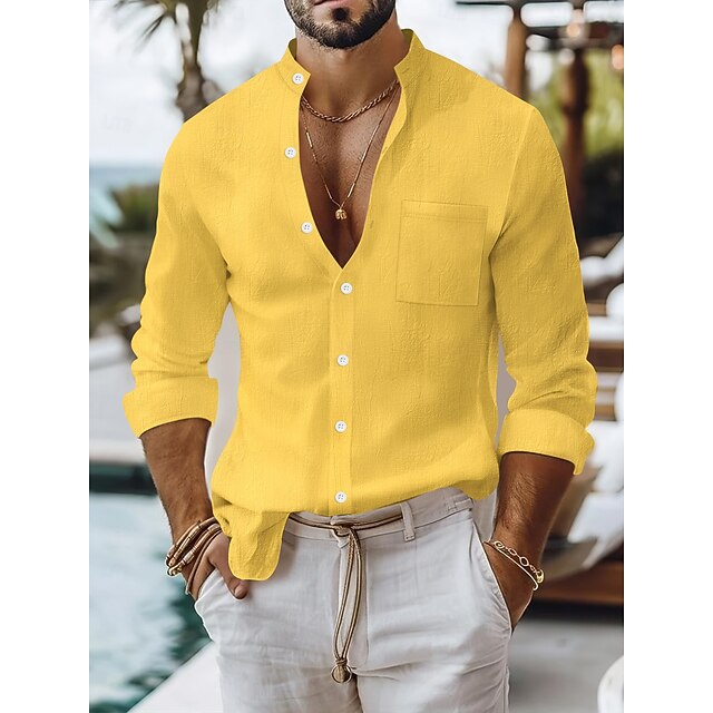 More information about Men's Shirt Linen Shirt Summer Shirt Beach Wear Button Up Shirt Plain Vacation Daily Black White Yellow Navy Blue Long Sleeve Band Collar Summer Spring & Summer Clothing Apparel Pocket