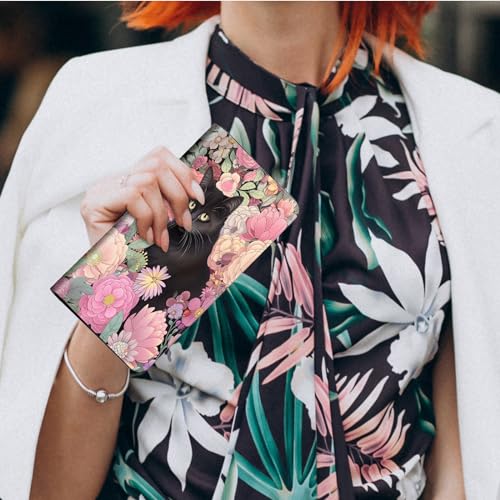 Wallet for Men Women & Phone Purse Wallet, RFID Blocking PU Leather Dual Magnetic Clasp Closure Phone Purse + Credit Card Holder for Phone Organizer Ladies Travel Purse,Black Cute Flowers Cat 2