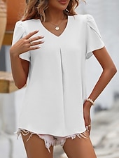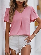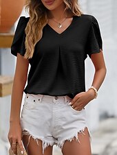 More information about Women's Blouse Dressy Tops Solid Color Plain Elegant Basic Short Sleeve V Neck Regular Tops Daily Ruched Black White Pink Blue Summer