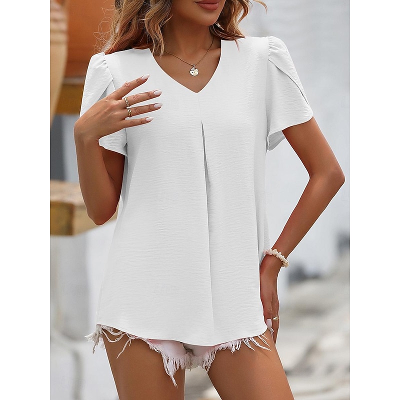 HOT ! Women's Blouse Dressy Tops Solid Color Plain Elegant Basic Short Sleeve V Neck Regular Tops Daily Ruched Black White Pink Blue Summer