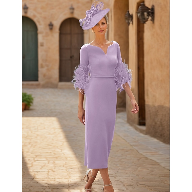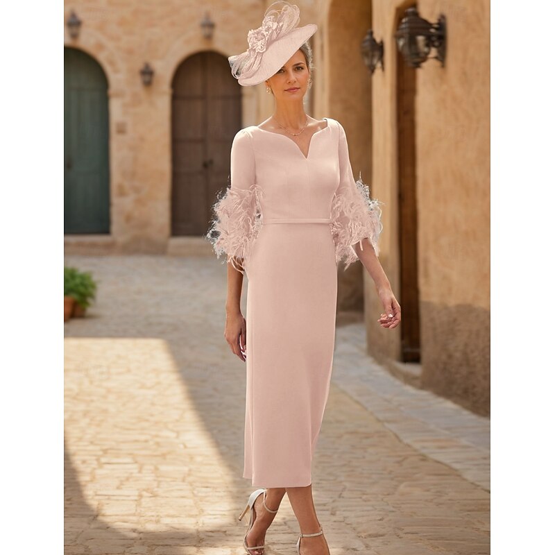HOT ! Sheath Mother of the Bride Dress Wedding Guest Elegant V Neck Ankle Length Stretch Fabric Half Sleeve with Feather Race Day Dress