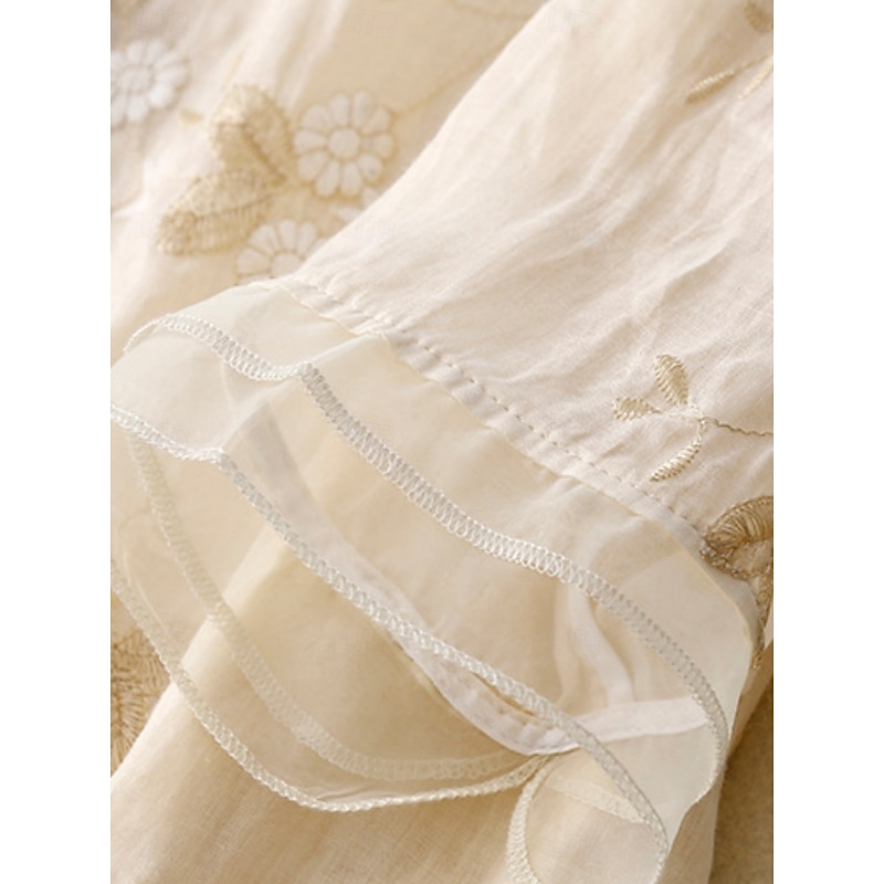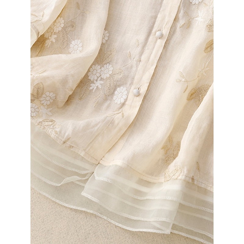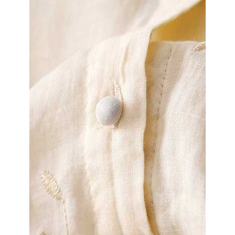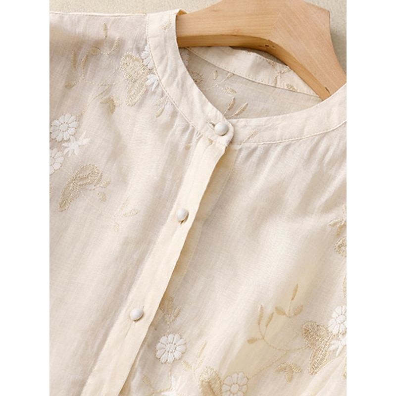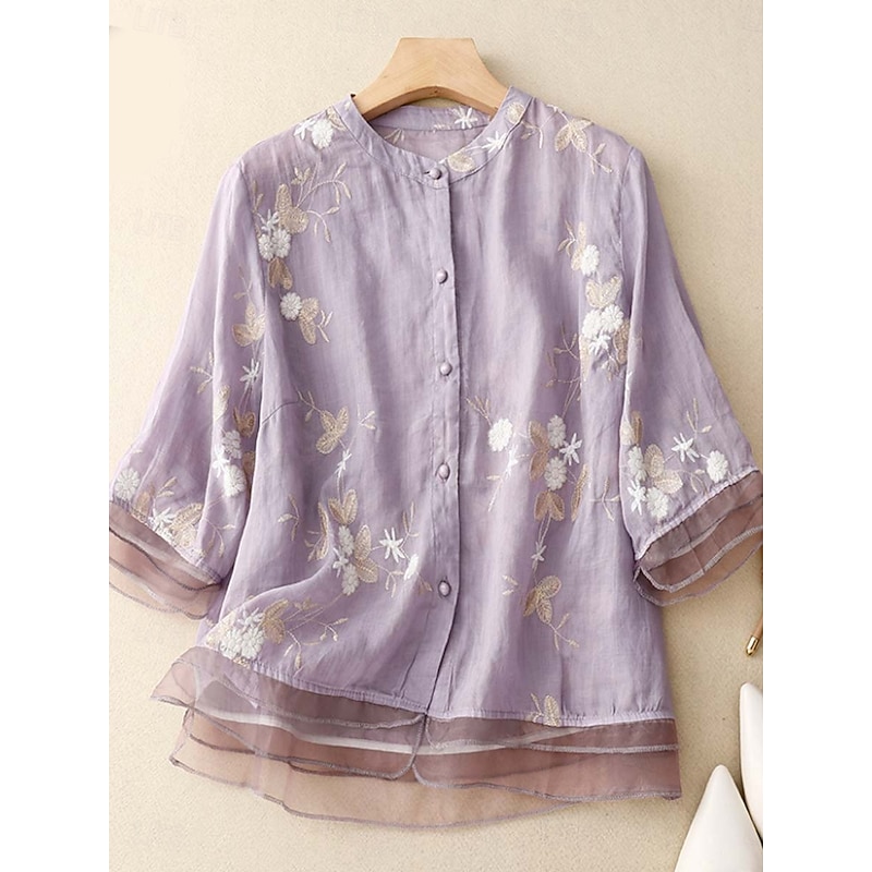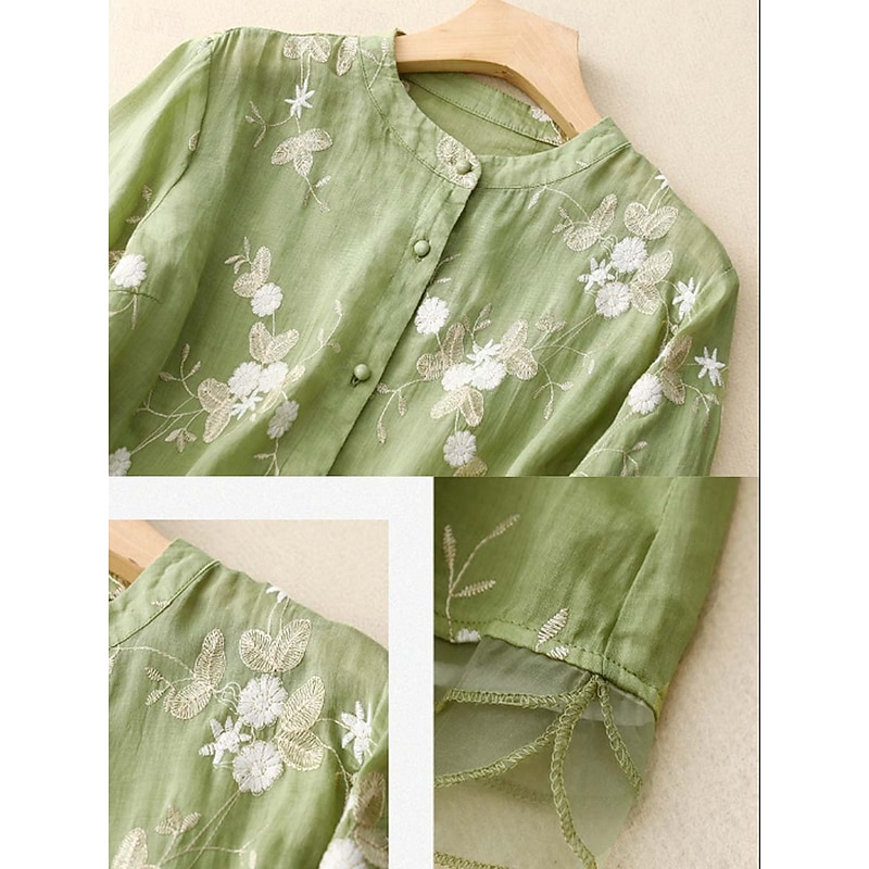 More information about Women's Shirt Cotton Linen Shirts Button Up Blouse Floral Basic Casual 3/4 Length Sleeve High Neck Regular Tops Daily Embroidered Buttons Yellow Purple Green Beige Summer Spring Fall