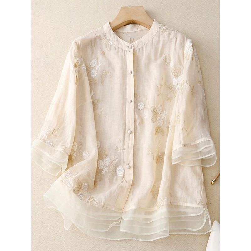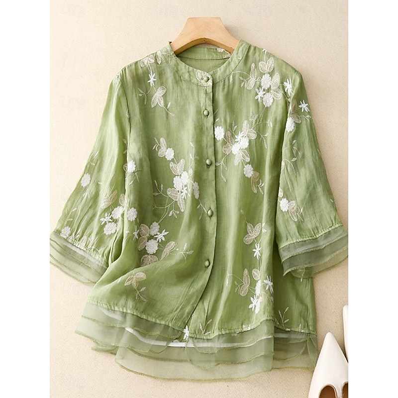 HOT ! Women's Shirt Cotton Linen Shirts Button Up Blouse Floral Basic Casual 3/4 Length Sleeve High Neck Regular Tops Daily Embroidered Buttons Yellow Purple Green Beige Summer Spring Fall