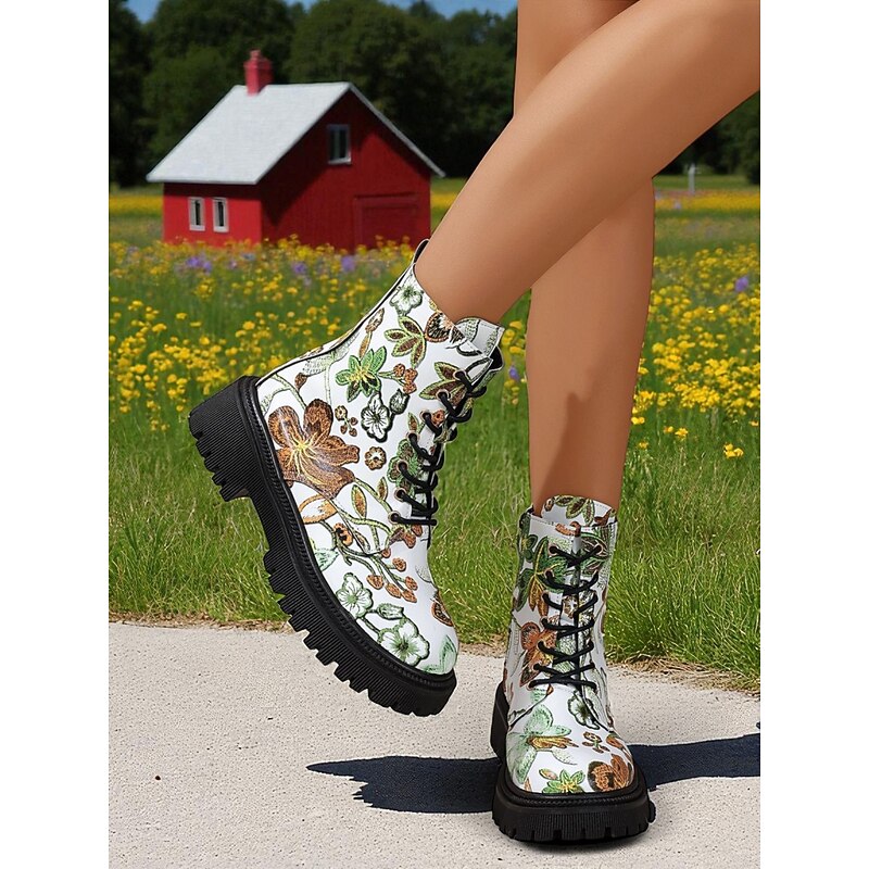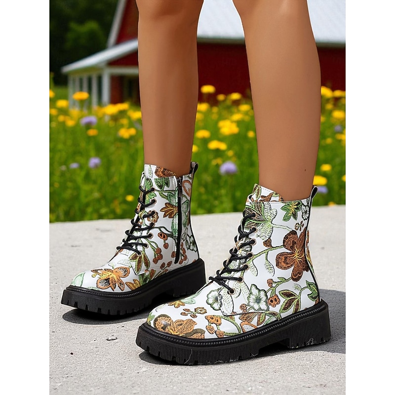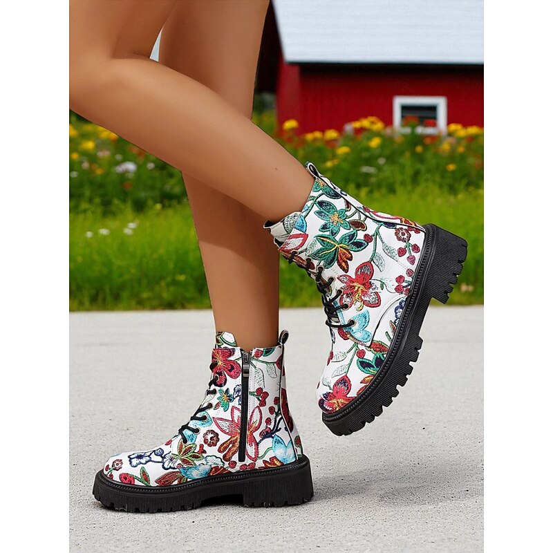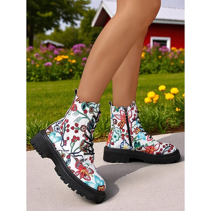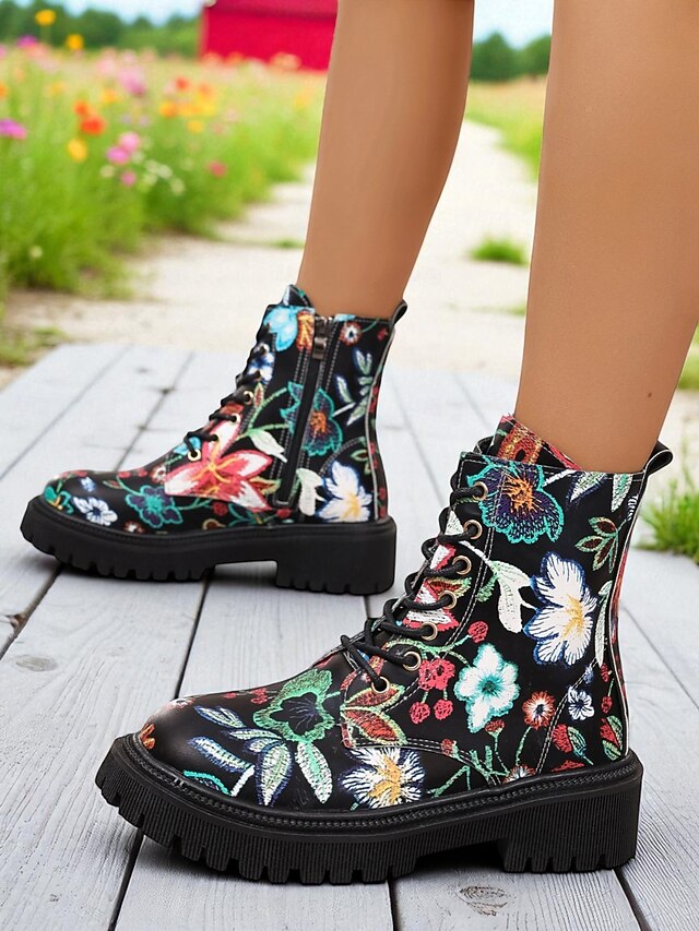 Women's Black Floral Print Combat Boots – Lace-Up Side Zip, Chunky Lug Sole, Stylish Casual & Festival Footwear 1