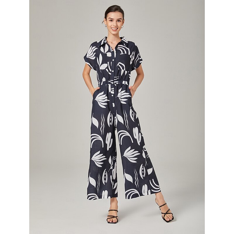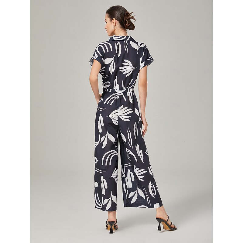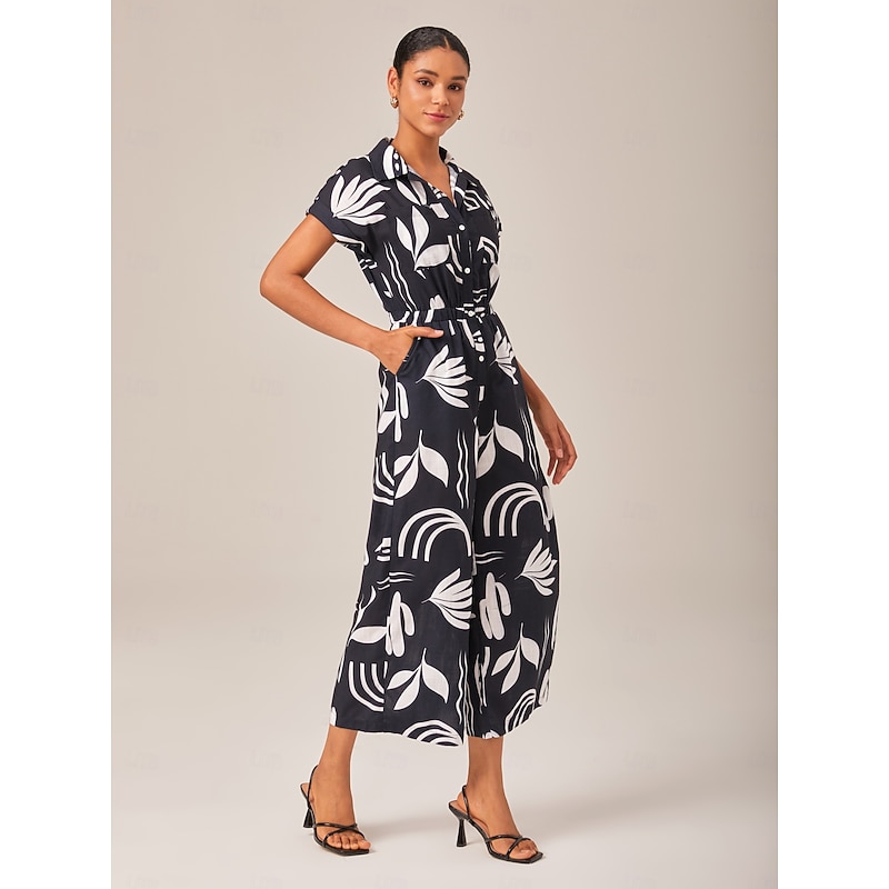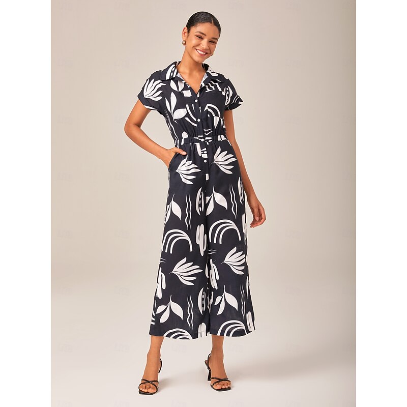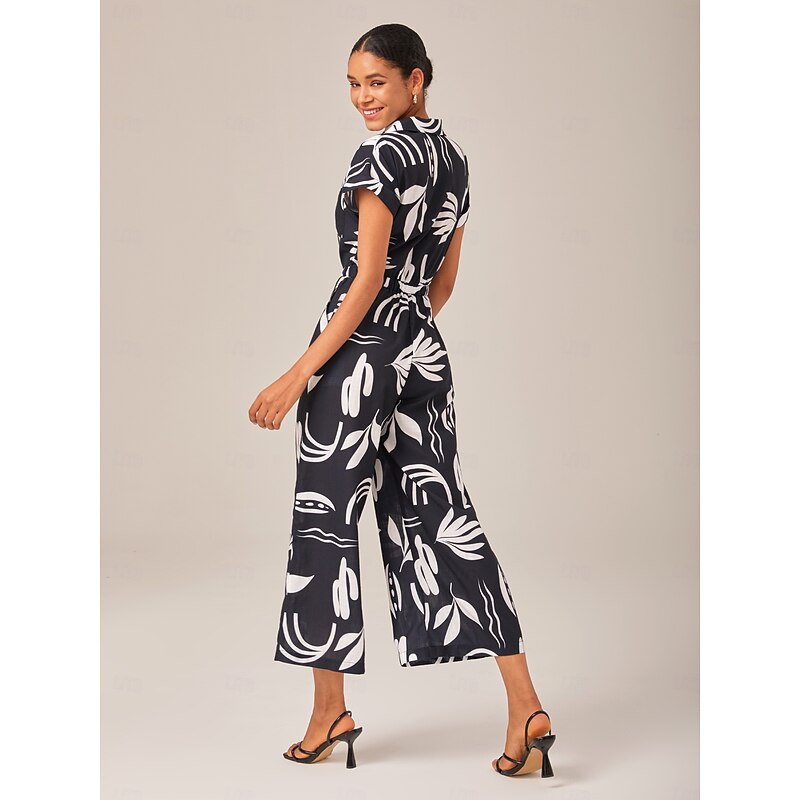 HOT ! Vacation Black and White Printed Linen-Like Jumpsuit