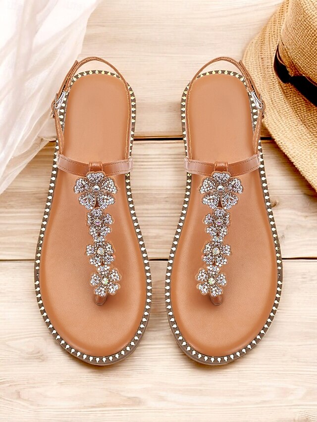 Women's Tan Rhinestone Flower Thong Sandals with Studded Edging – Elegant Flat Sandals for Summer, Beach, and Casual Occasions 10