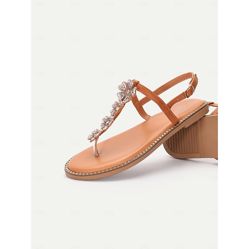Women's Tan Rhinestone Flower Thong Sandals with Studded Edging – Elegant Flat Sandals for Summer, Beach, and Casual Occasions 8
