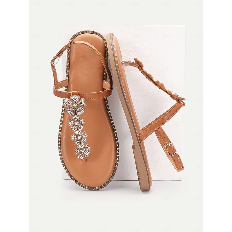 More information about Women's Tan Rhinestone Flower Thong Sandals with Studded Edging – Elegant Flat Sandals for Summer, Beach, and Casual Occasions