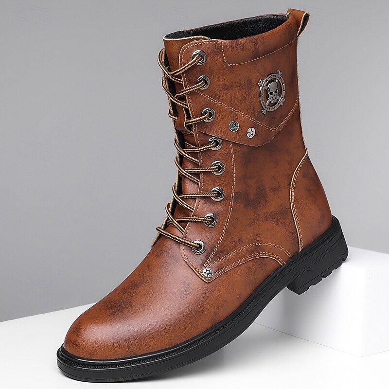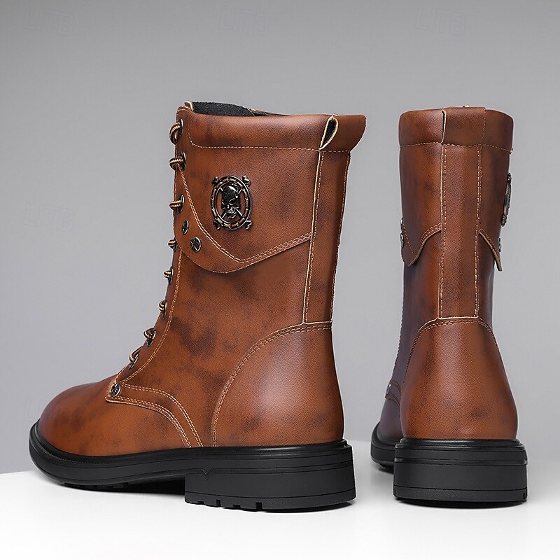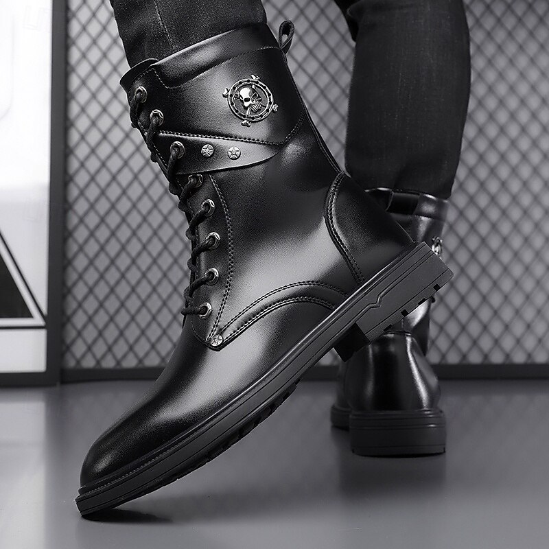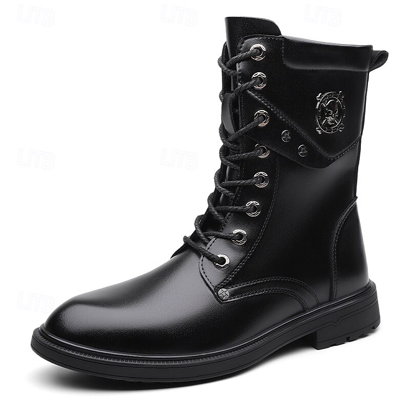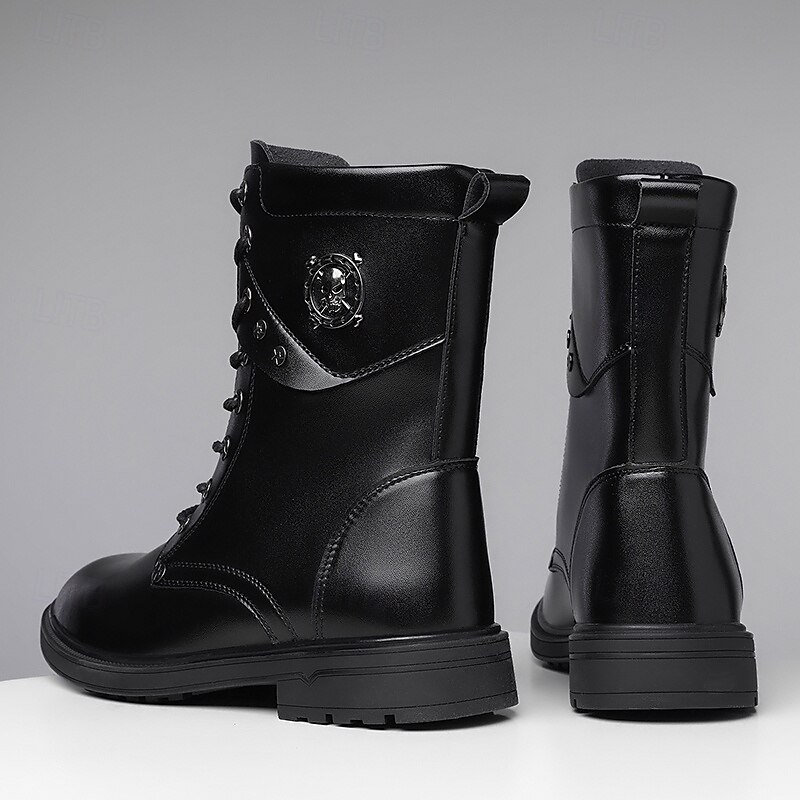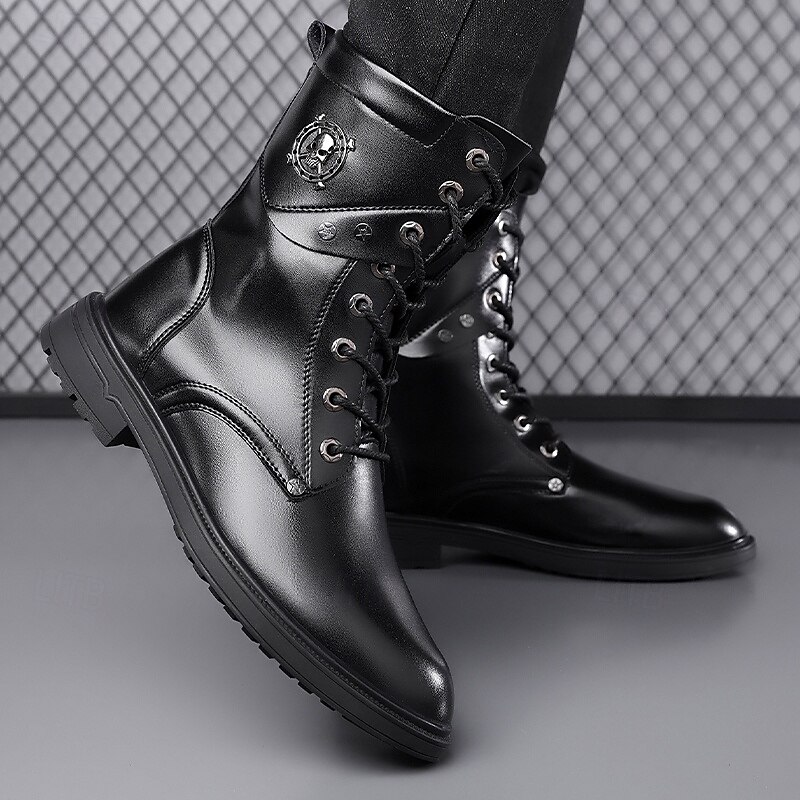 HOT ! Black Faux Leather Lace-Up Men's Combat Boots with Round Metal Logo, Chunky Sole, and Military Style – Perfect for Harley Riders, Punk Rock Fashion, Casual Outdoor Wear and Everyday Use