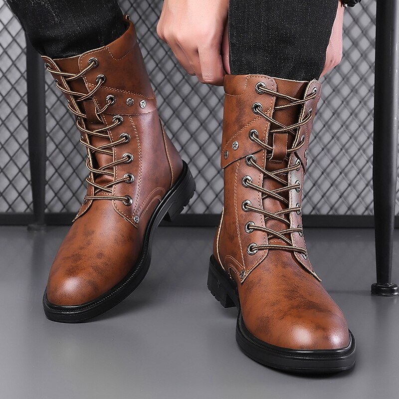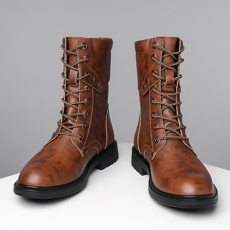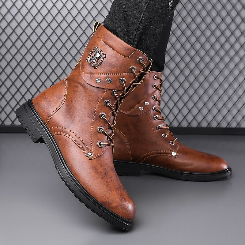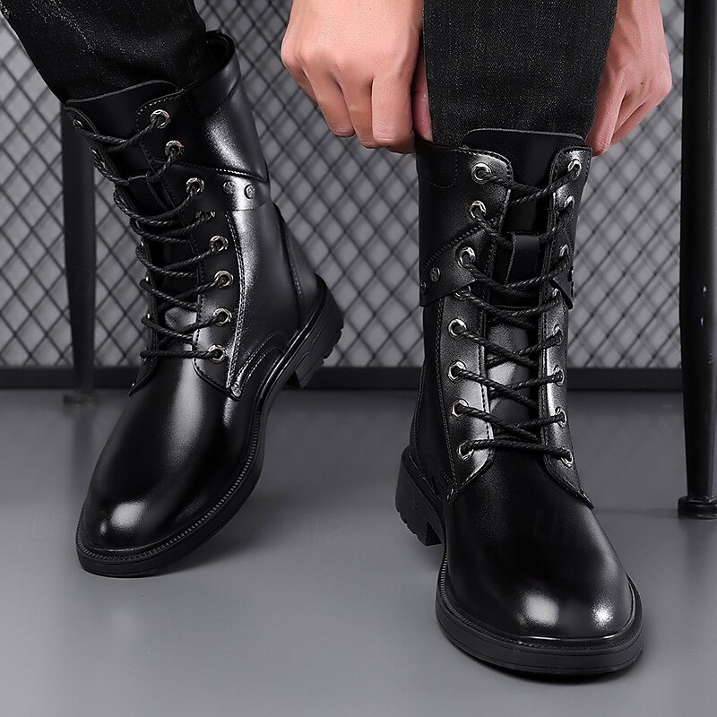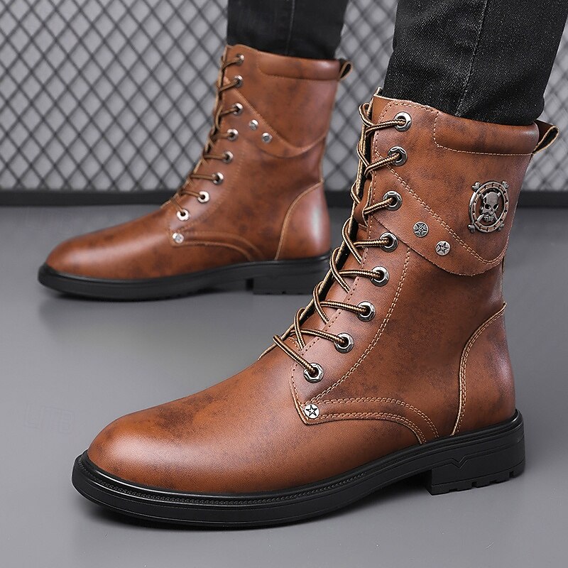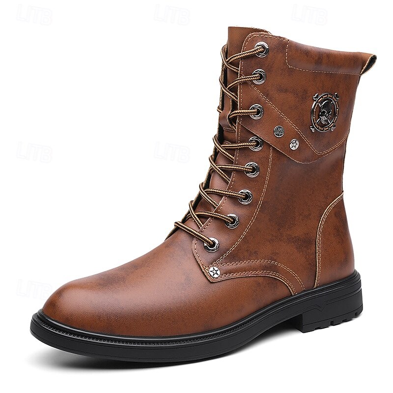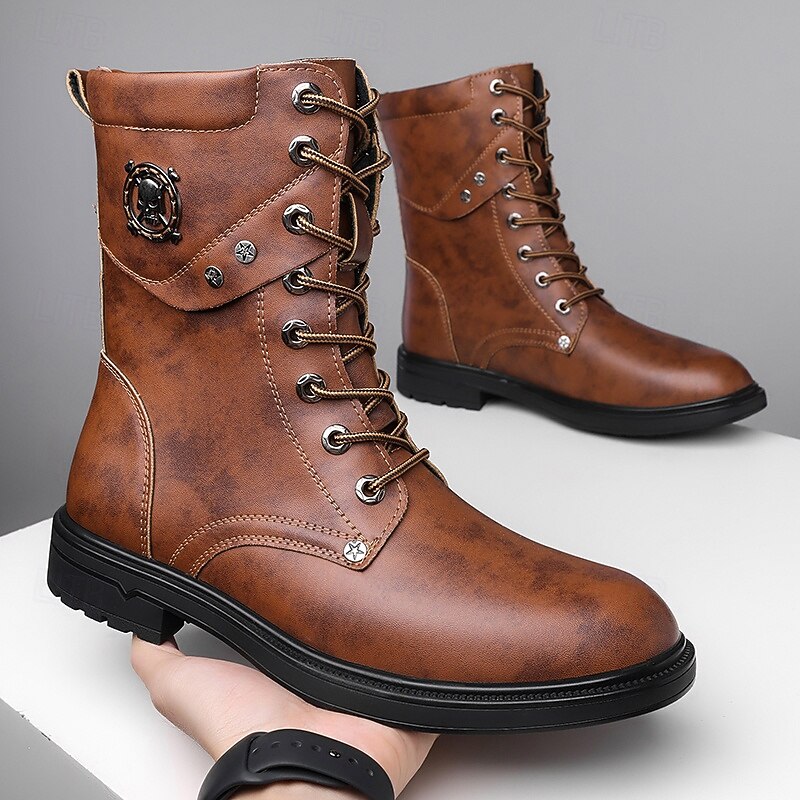 HOT ! Black Faux Leather Lace-Up Men's Combat Boots with Round Metal Logo, Chunky Sole, and Military Style – Perfect for Harley Riders, Punk Rock Fashion, Casual Outdoor Wear and Everyday Use