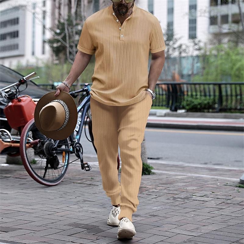: The outfit includes a short-sleeved henley top and drawstring waist pants, featuring a classic ribbed design for a modern, sleek look. The top's henley neckline with a button placket adds a contemporary touch to the traditional t-shirt style, while the jogger-style pants provide a relaxed yet tailored fit.