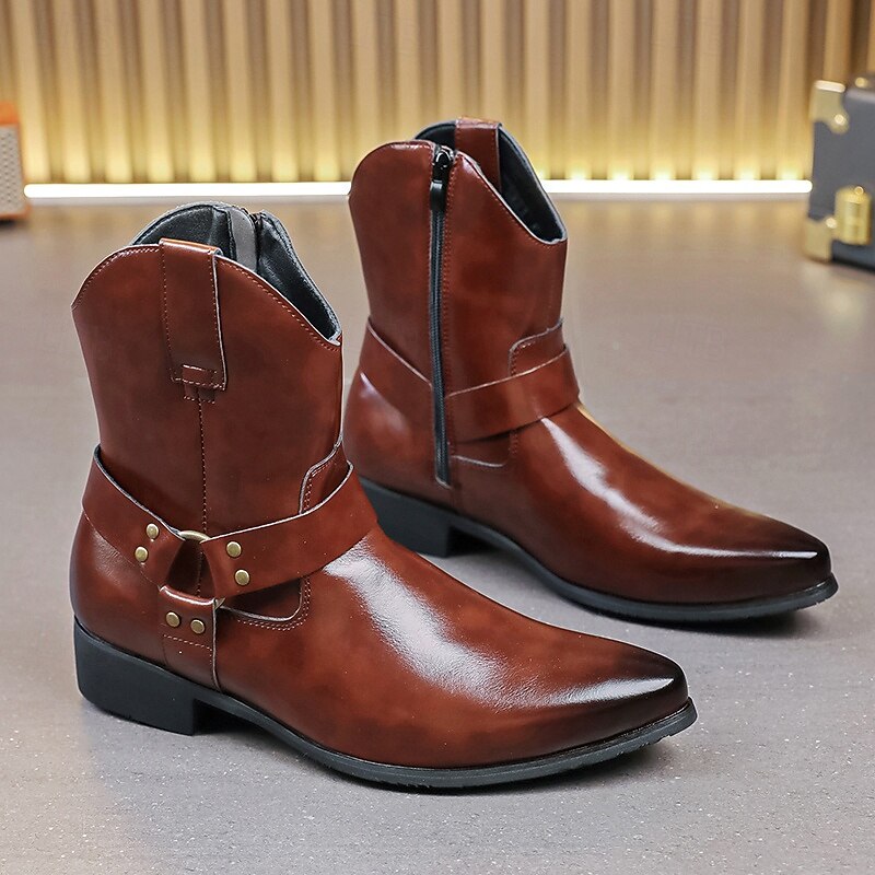 Men's Brown Leather Ankle Boots with Side Zipper and Buckle Strap, Stylish Dress Boots for Business, Evening Party and Formal Occasions 24