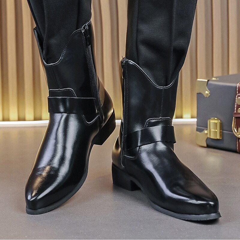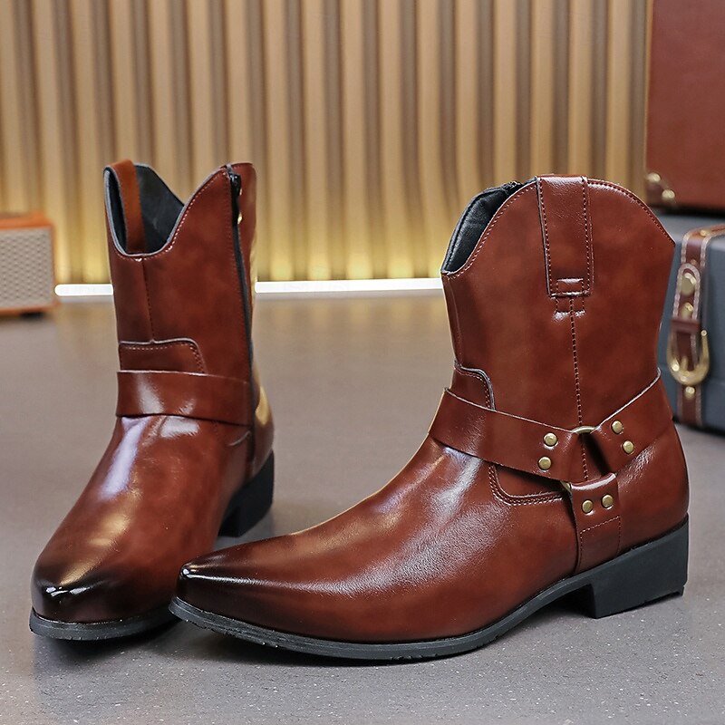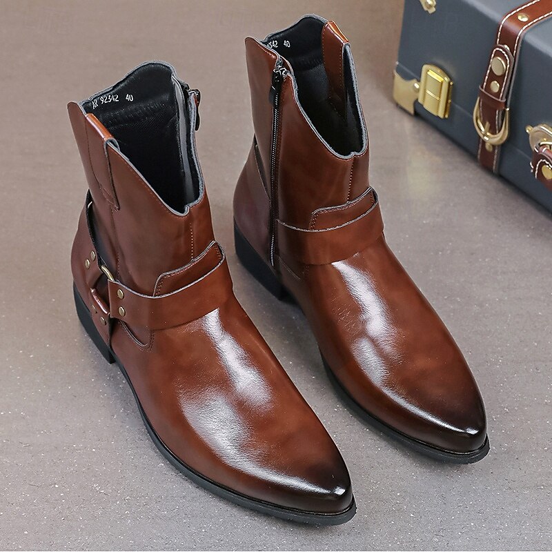 Men's Brown Leather Ankle Boots with Side Zipper and Buckle Strap, Stylish Dress Boots for Business, Evening Party and Formal Occasions 1
