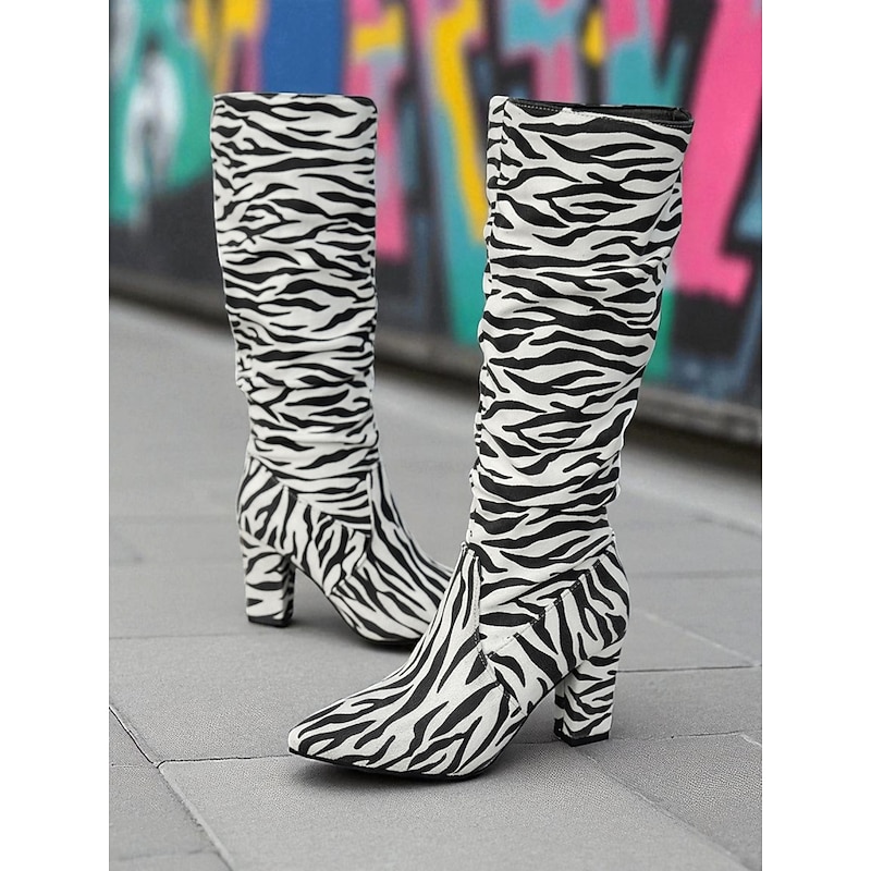 Women's Zebra - Striped Slouchy Knee - High Block Heel Boots - Edgy Streetwear Shoes for Casual Hangouts and Night Events 6