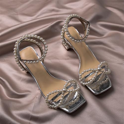 trending ! Women's Pearl Chunky Heel Open Toe Ankle Strap Block High Heel Dress Party Sandals Shoes