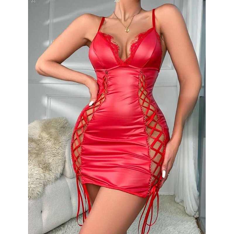 Highlights [Fabric] : This seductive mini dress is crafted from a sleek blend of spandex and polyester, ensuring both comfort and a flattering, form-fitting look. The faux leather material enhances its edgy appeal while offering micro-elasticity for ease of movement. [Silhouette] : Featuring a body-hugging silhouette, this dress accentuates feminine curves with its sophisticated structure. The sleeveless design and thin spaghetti straps provide a comfortable and secure fit, complementing the dress's overall allure. [Design Highlights] : The dress stands out with its plunging neckline adorned with delicate lace trim, adding a feminine touch to its bold style. Crisscross lace-up details on the sides create alluring cutouts, while the backless design contributes to its captivating and dramatic appeal. [Occasions] : Ideal for a night out or special occasion, this dress offers a striking blend of edgy style and sensuality. Whether worn for an intimate evening or fashionable event, it promises to turn heads and make a statement. [Size Range] : Available in sizes S, M, L, XL, and 2XL, this dress caters to a variety of body types, ensuring a perfect fit for everyone. The versatile size range allows it to suit different preferences and occasions.