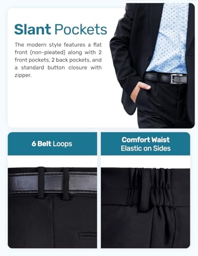 • ELEGANT STYLE & FIT: With a sleek flat-front design, these black dress pants deliver a modern and elegant look. The unique style features a flat front (non-pleated) along with 2 front pockets, 2 back pockets, and a standard button closure with zipper. Perfect for weddings, proms, school events, or family gatherings, they pair well with dress shirts and shoes for a complete outfit.