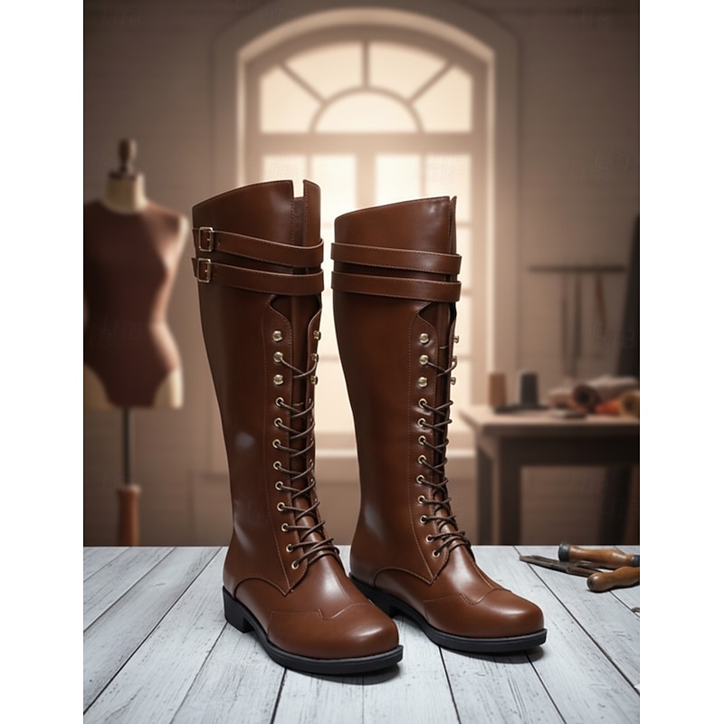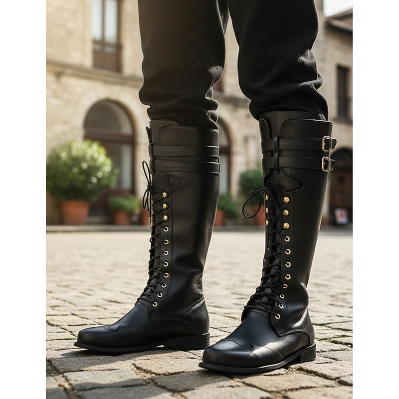 Men's Black Lace-Up Knee-High Boots with Buckle Straps – Vintage-Style Military Combat Boots for Outdoor and Casual Wear 1