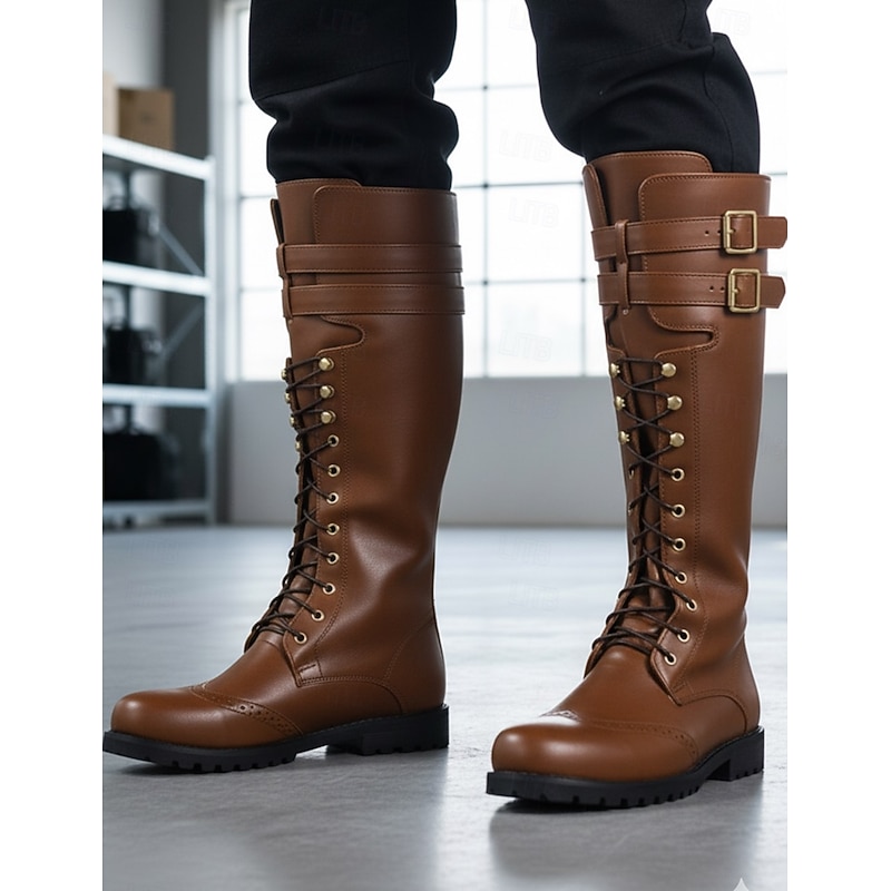 Men's Black Lace-Up Knee-High Boots with Buckle Straps – Vintage-Style Military Combat Boots for Outdoor and Casual Wear 7