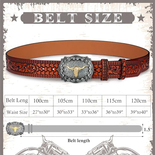 HOT ! Western Leather Buckle Belts for Men Women- Longhorn Bull Cowboy Cowgirl Leather Belt for Jeans