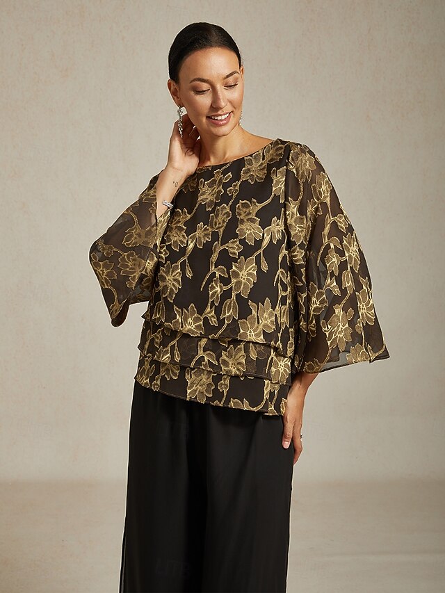 HOT ! Women's Blouse Chiffon Tops Floral Elegant Stylish Casual Crew Neck Regular Tops Wedding Guest Date Night Outfits Cocktail Attire Lace Gold Spring Fall Winter