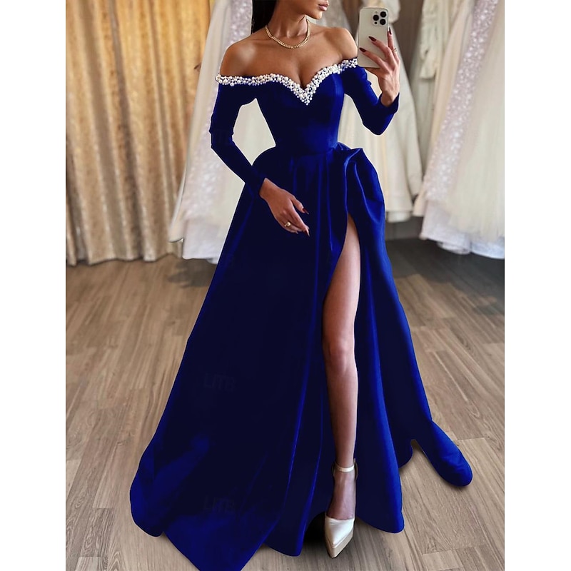 HOT ! A-Line Evening Gown Black Dress Formal Masquerade Sweep / Brush Train Long Sleeve Off Shoulder Satin with Pearls Slit