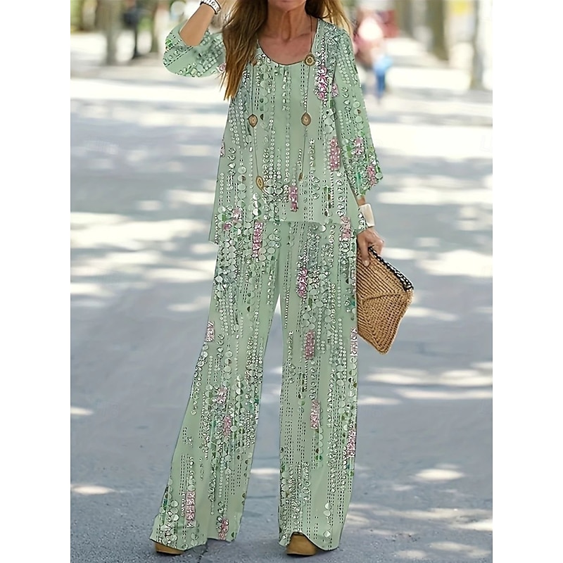 Women's 2 Pieces Basic Neon & Bright Shirt Blouse 3/4 Length Sleeve V Neck Floral Print Casual Linen Like Green Summer Regular Fit 2