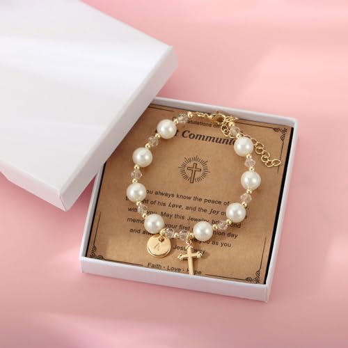 Initial A-Z Letter First Communion Gifts for Girls,Rosary Pearl Cross Bracelet for Christian Catholic Goddaughter