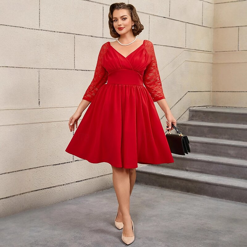 Retro Vintage 1950s Rockabilly Above Knee Dress A Line Dress Flare Dress Plus Size Lace V Neck Fancy Dress Women's Wedding Vacation Party & Evening Adults' Dress Spring & Summer 1