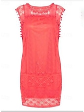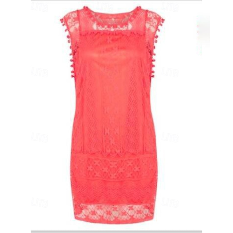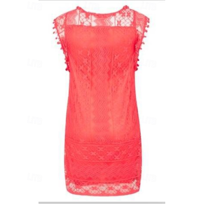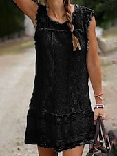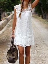 Highlights - Get ready for summer in this classic white dress - Made with lightweight polyester fabric, perfect for vacation - Sleeveless design with a stylish lace and patchwork detail - Flattering crew neck neckline - Mini dress length, ideal for any occasion