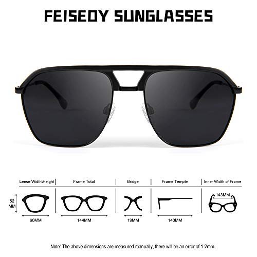 Resin polarized lens: We specially use resin lens to block UVA and UVB. The lens is covered with a polarizing film to filter out glare, scattered light and other messy light, and protect the eyes from the interference of irritating light.Suitable for outdoor sports: outdoor glare is caused by scattered light and reflected light in the light. Polarized lenses can effectively filter astigmatism and reflected light. Wear them when driving or traveling. The light is soft and not dazzling, and the vision is clearer.Comfortable experience: Thin lenses and comfortable nose pads reduce the pressure on your nose bridge and bring you a comfortable experience.FEISEDY Product Dimensions:Lens Width:57 MM/2.24 in, Lens Height:56 MM/2.20 in, Temple Length:140MM/5.51 in, Frame total Length:143MM/5.63 in, Nose Bridge:19MM/0.75 in. Attention:Manual measure, there may be 1-3mm error.FEISEDY is aim to bring you high quality fashion experience in sunshine and nature. Perfect for everyday use. High quality materials and excellent craftsmanship ensure long-lasting durability.