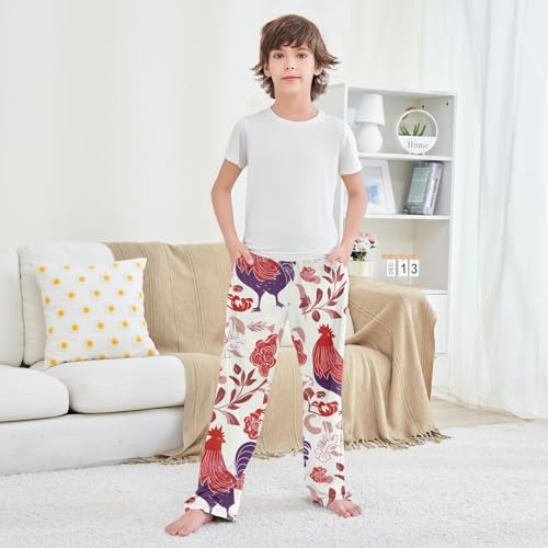 Rooster Rose Floral Boys Long Pants Soft Trousers Elastic Waist Kids Lounge Bottoms with Pockets S-XL 4