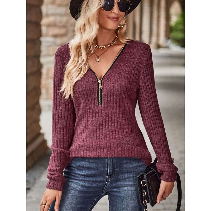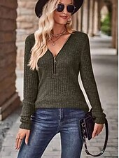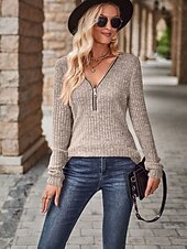 Highlights [Fabric:] Crafted from a cozy polyester ribbed knit, this women's tunic combines comfort and fashion. Its micro-elastic fabric provides both warmth and a snug fit, making it ideal for fall and winter days. [Silhouette:] Designed with a regular fit, this tunic features long sleeves and a slightly fitted silhouette, enhancing its classic look. The regular top length makes it perfect for layering with other garments during the cooler seasons. [Design Highlights:] The tunic showcases a practical front zipper that allows for adjustable necklines, creating both style and versatility. Its classic V-neck offers a chic appearance, and the solid neutral beige hue makes it easy to pair with a variety of outfits. [Occasions:] Suitable for daily wear and work environments, this tunic is perfect for everyday casual settings. Whether you're heading to the office or enjoying a relaxed weekend, it offers both style and function. [Size Range:] Available in sizes S, M, L, XL, and 2XL, this tunic caters to a wide range of body types, ensuring a comfortable fit for everyone.