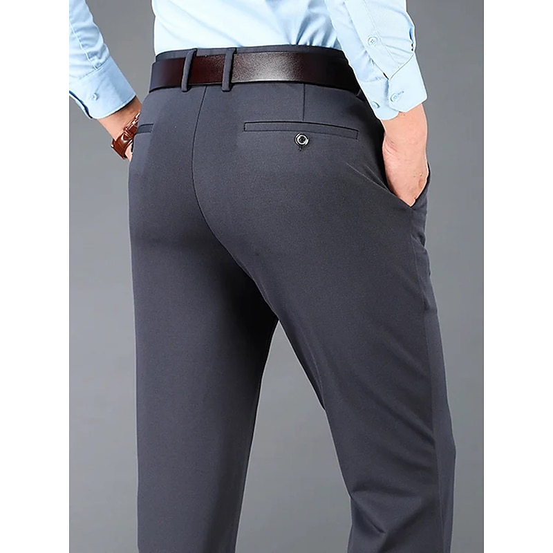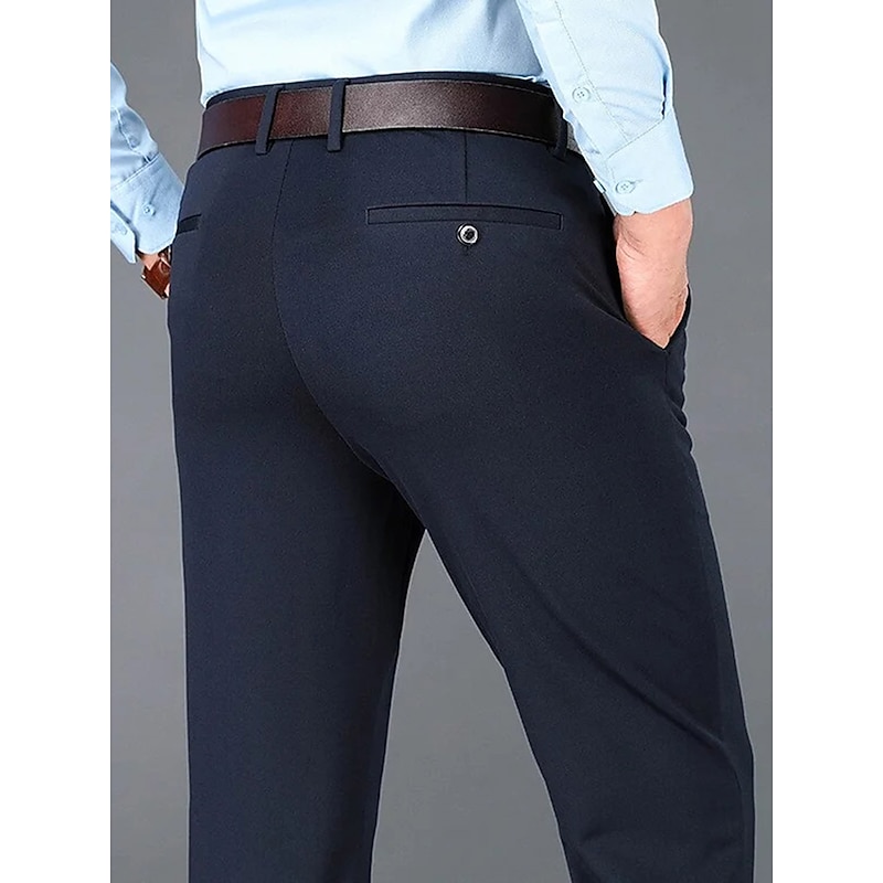 Highlights [Fabric] Crafted from a breathable, high-quality polyester blend, these men's trousers provide softness and comfort, ideal for spring and summer wear. The fabric boasts a sleek, smooth finish with a slight stretch, ensuring both aesthetic appeal and a comfortable fit. [Fit] Featuring a regular fit type, these trousers taper elegantly from the waist to the ankles, offering a modern, tailored appearance that complements any physique. The mid-waist design ensures a comfortable and flattering fit for everyday wear. [Design Highlights] These trousers are equipped with functional pockets and a classic straight waistband with belt loops, secured by a button closure and zip fly. The meticulous stitching adds to the refined construction, while the dark navy blue color offers a versatile, classy look suitable for various occasions. [Occasions] Perfect for daily wear, going out, and outdoor activities, these trousers suit a variety of settings. Whether attending a casual outing or a more formal event, they add a fashionable and sophisticated touch to any ensemble. [Size Range] Available in a variety of sizes, from 31 to 40, these trousers accommodate different body types, ensuring a comfortable and sleek fit for a wide range of individuals. Perfect for everyday use. superior materials and excellent craftsmanship ensure long-lasting durability.