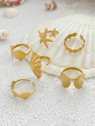6PCS Chunky Gold Starfish Shell Rings for Women Trendy Dainty Summer Beach Stackable Stainless Steel Ring Surfer Fashion Statement Beachy Boho Jewelry Gifts 5