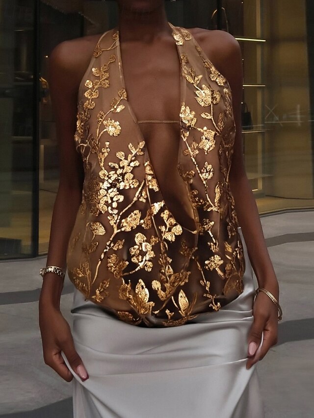 More information about Women's Sequin Sparkly Party Glitter Flower Stylish Modern Sleeveless V Neck Regular Tops Daily Going out Print Backless Brown Green Summer