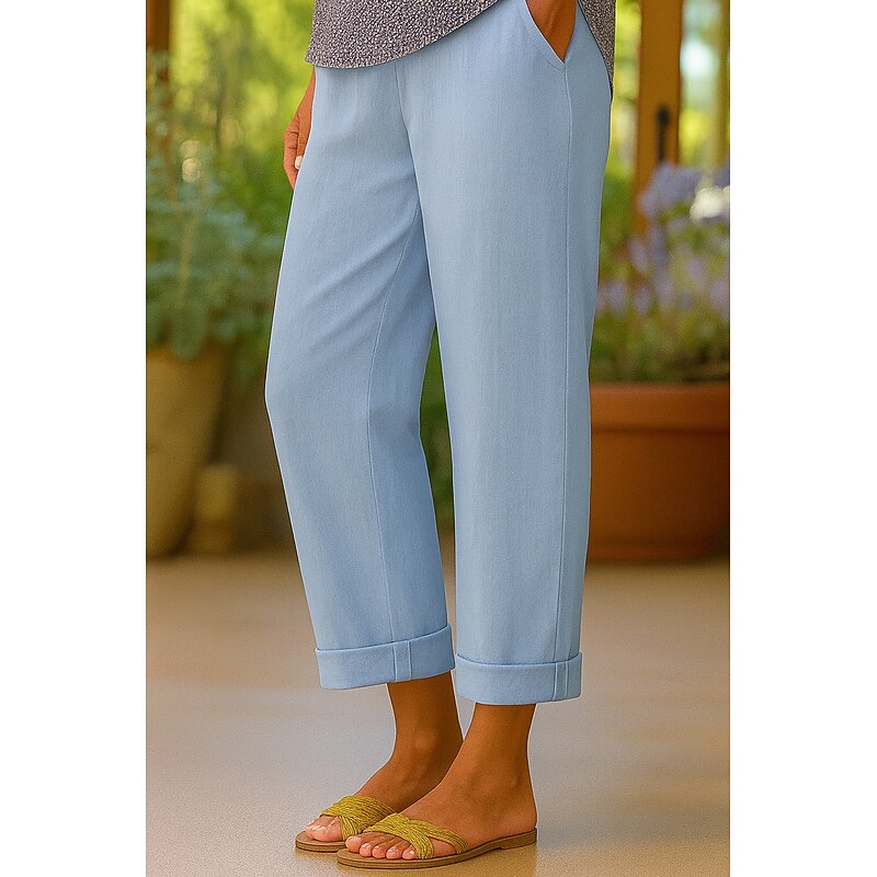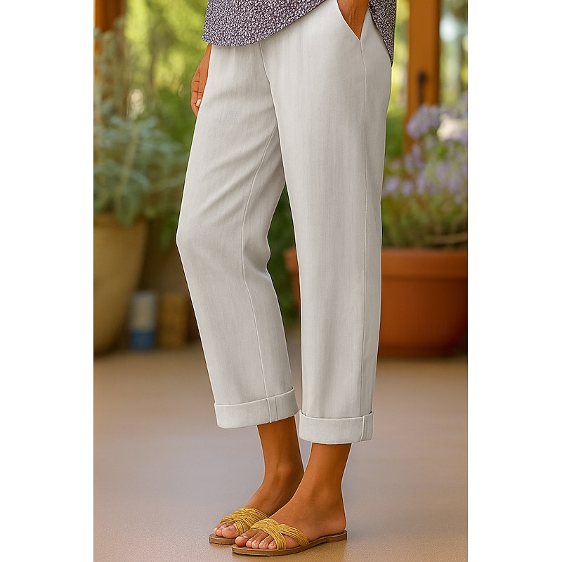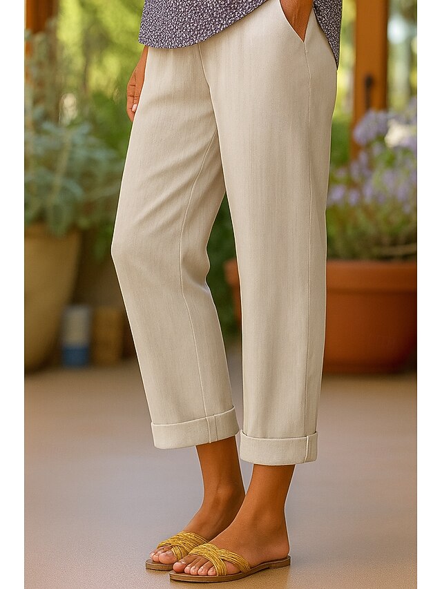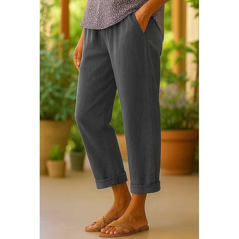 Women's Cotton Pants Vacation Vintage Ethnic Style Ankle-Length High Waist Plain Comfy Breathability Soft Micro-elastic Army Green Dark red Black White Summer Spring Loose Fit 7