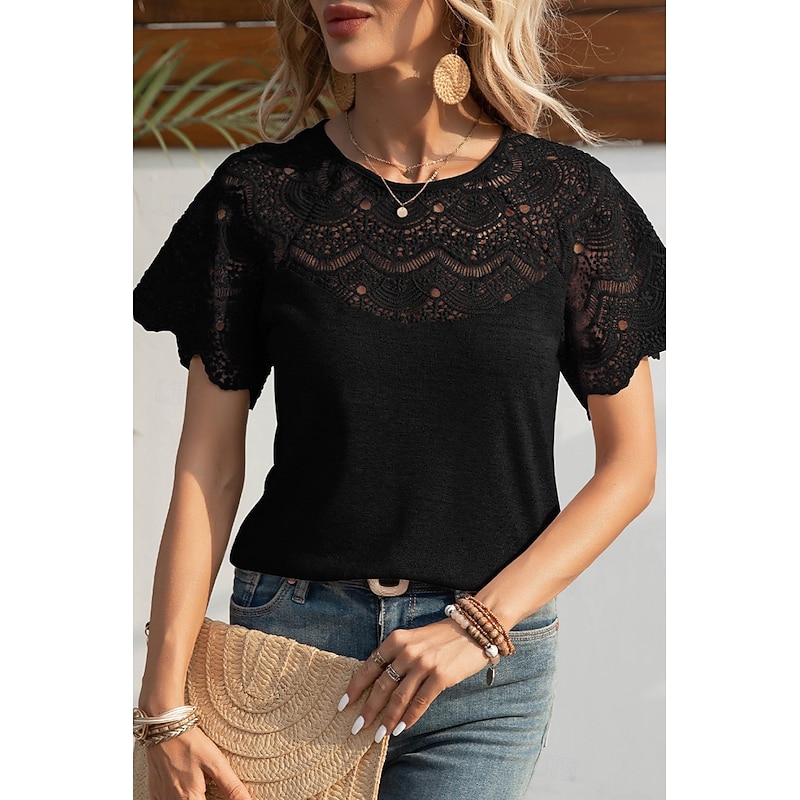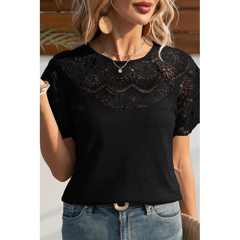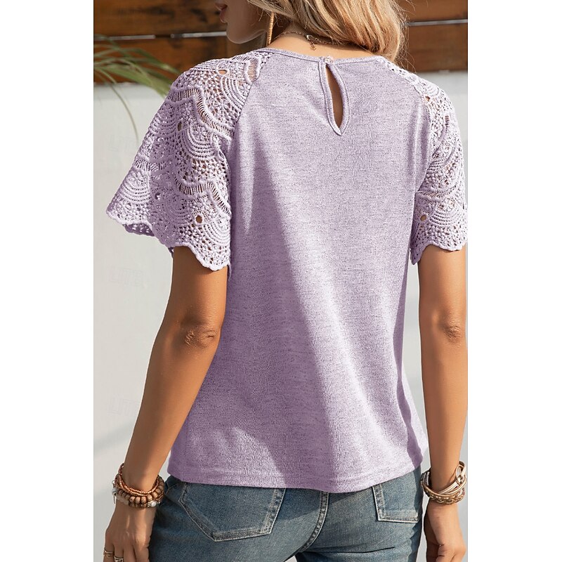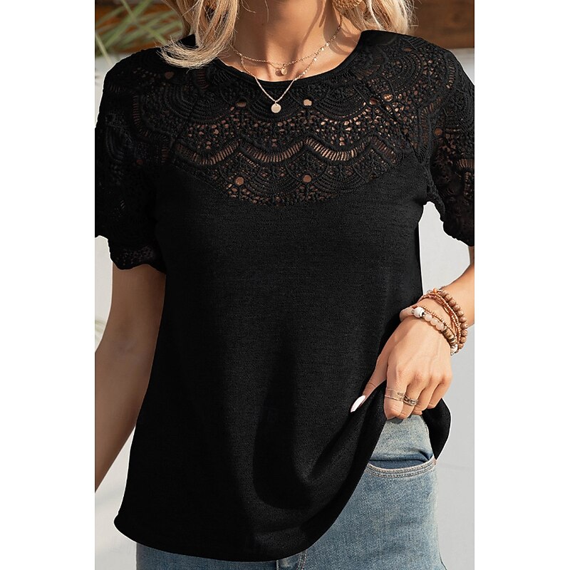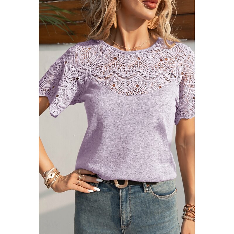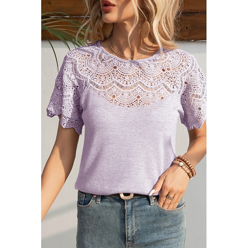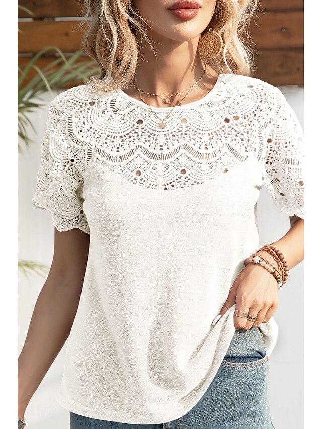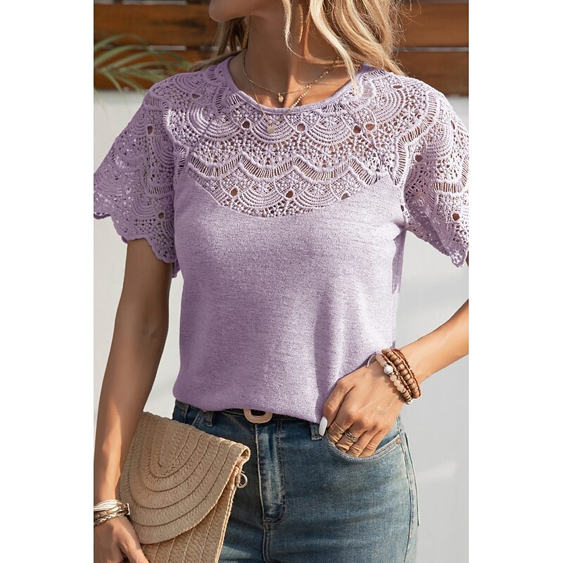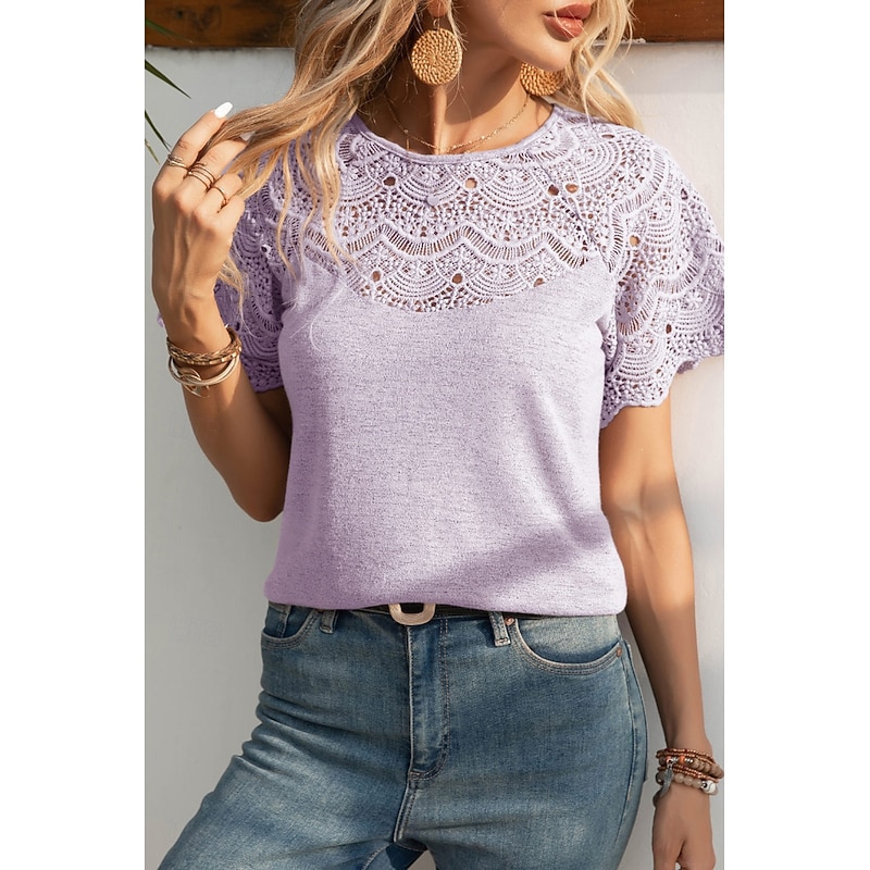 HOT ! Women's Blouse Lace Tops Plain Casual Short Sleeve Crew Neck Regular Tops Daily Holiday Going out Lace Black White Purple Summer