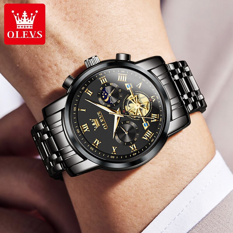 OLEVS Men Quartz Watch Fashion Casual Wristwatch Moon phase Luminous Calendar Chronograph Stainless Steel Watch 9