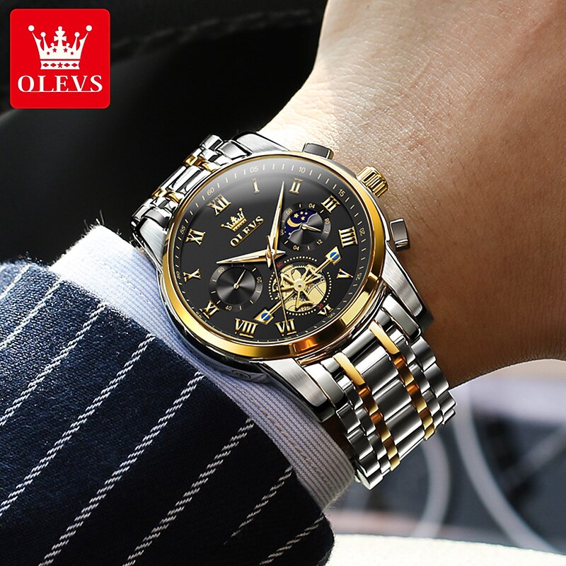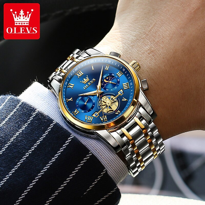 OLEVS Men Quartz Watch Fashion Casual Wristwatch Moon phase Luminous Calendar Chronograph Stainless Steel Watch 12
