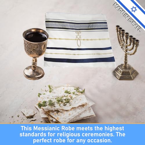 • Messianic Robe Design – Featuring a beautiful blue and gold design, this Christian prayer shawl blends Messianic symbolism with timeless craftsmanship. The ideal tallit prayer shawl for women and men seeking a spiritual connection.