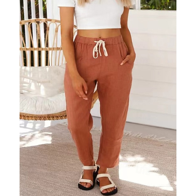 trending ! Women's Cotton Linen Pants Slacks Fashion Streetwear Full Length Natural Plain Pocket Elastic Drawstring Design Outdoor relaxing Vacation Going out Rust Light Sky Blue Grey Black Summer Regular Fit
