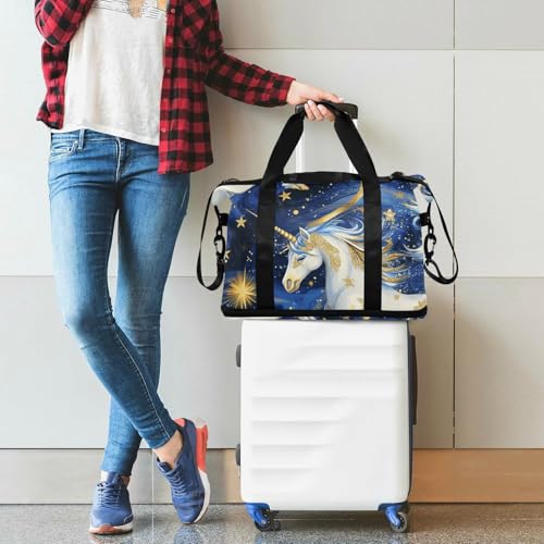 Cartoon Cute Blue and Gold unicorns Overnight Travel Duffel Bag Weekender Overnight Bag with Adjustable Strap for Business Trips 2 Pcs Set