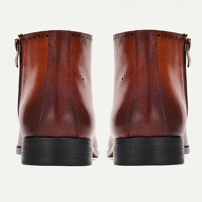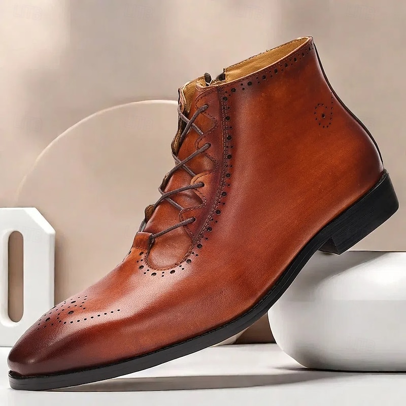 HOT ! Men's Brown Lace-Up Ankle Boots with Brogue Detailing - Premium Cowhide Leather Dress Boots for Formal & Business Wear