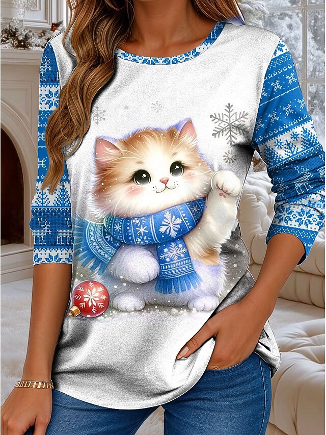 HOT ! Christmas Women's T Shirt Graphic Cat Christmas Vintage Fashion Stylish Long Sleeve Crew Neck Regular Tops Daily Weekend Print Pink Red Blue Green Fall Winter