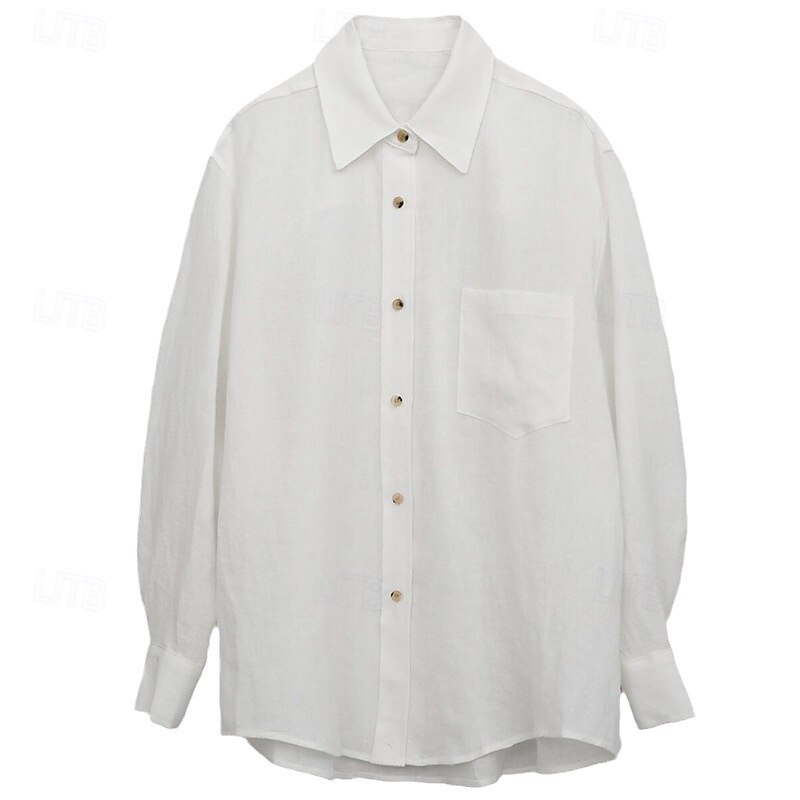Women's 100% Linen Shirt Solid Color Elegant Vintage Daily Long Sleeve Shirt Collar Regular Tops Work Daily Holiday Big white Summer Spring Fall 8
