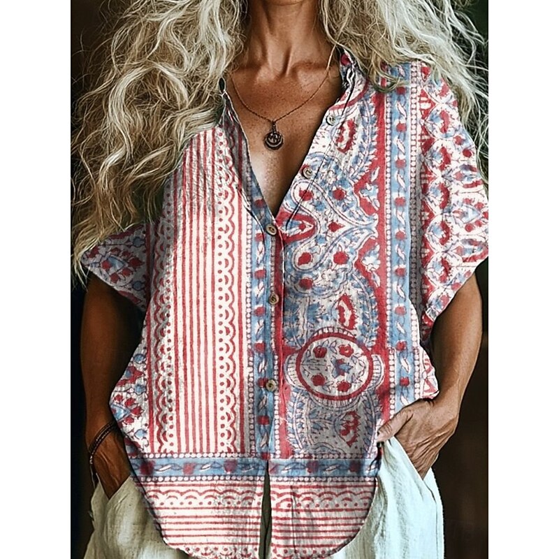 HOT ! Women's Shirt Long Sleeve Button Down Blouse Floral Graphic Bohemia Vintage Tropical Short Sleeve Shirt Collar Regular Tops Daily Pink Red Light Brown Orange Green Summer Spring