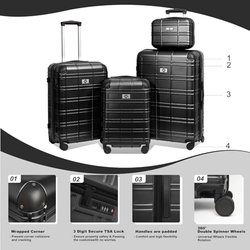 Luggage Sets Abs+Pc Hardshell 4Pcs Luggage Hardside Lightweight Spinner Wheels Suitcase With Tsa Lock (12/20/24/28), Black 4