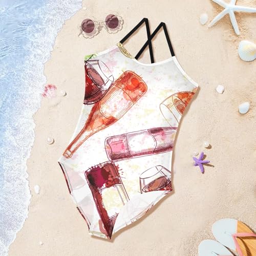 Girls One Piece Swimsuits Wine Bottles and Glasses Pattern Sport Halter Swimwear Beach Bathing Suit, 5-6T 6